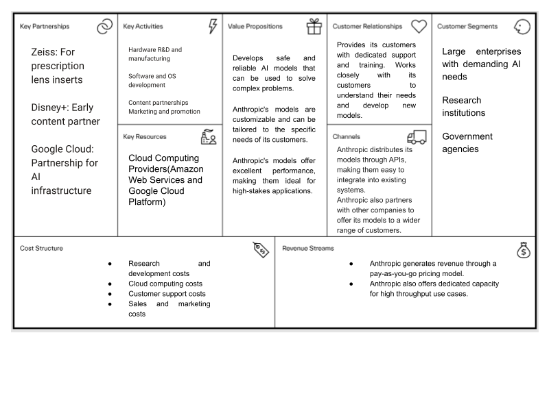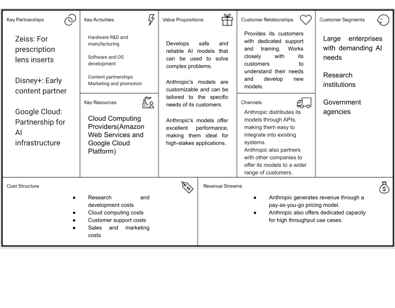 Anthropic should envision the evolution of its business model by embracing ‘Co-opetition’ with industry leaders like Google, Amazon, Zoom, Salesforce and other potential investors. It is essential for Anthropic to expand beyond conversational AI into other AI domains and apply their principles to new technology domains. This can be achieved by integrating with business software and workflows to provide AI services for partners and related platforms. Anthropic can also offer industry-specific solutions and provide professional services to help companies implement Anthropic's AI.