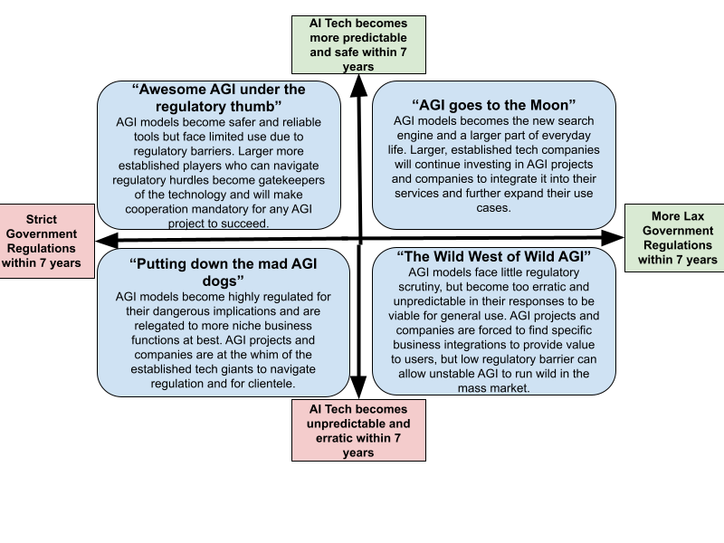 Specifically, in the Technological factors, the safety and predictability of AI tech is the most crucial, and among the Political factors, the rigidity of the government regulations in various geographical areas is the most unpredictable and important to consider.