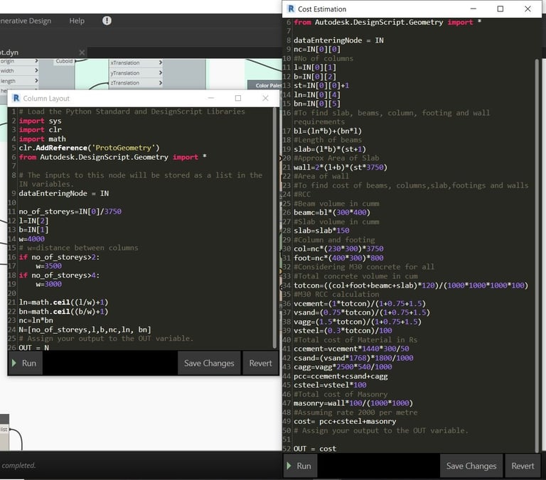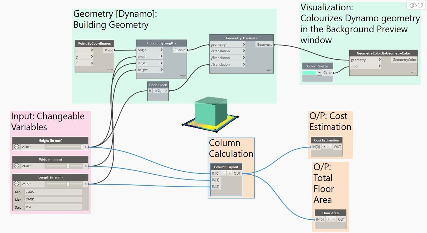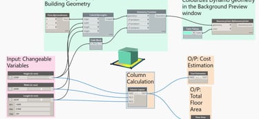 The output values were calculated using Python Script. I made a node called 'Column Calculation' in which I took the height, width and length of the building as inputs. The output of the 'Column Calculation' node is a list of the following values: number of floors, length of the building, width of the building, number of columns, number of columns along length and breadth. This way I could get the column layout of the building for cost estimation.