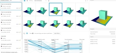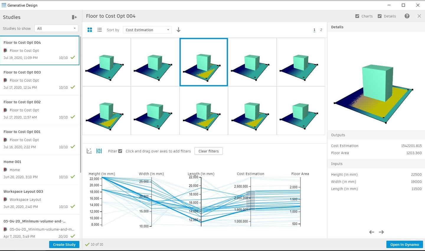 Generating this study gave a number of design solutions and data. The details of each solution are available on the right side of the window. There are several options to visualize data of the designs generated.