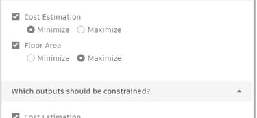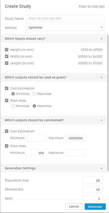 The Dynamo file (.dyn) was exported for generative design and a study was created. The input that should be varied were selected and output constraints were given. The goals determined were to minimize cost estimation and maximize floor area. The population size, number of generations and seeds was used as default.